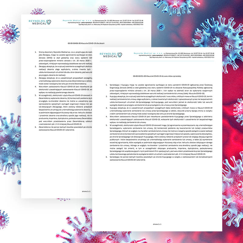 Klauzule nie oznaczają, że zasady naszej pracy ulegają automatycznie zmianie. Jednak w przypadku, kiedy okoliczności pandemiczne będą miały istotny wpływ na naszą zdolność do realizacji zamówienia, klauzule te zawierają informacje o ramowych zasadach działania. W każdej sytuacji w celu ich użycia przez nas, otrzymają Państwo stosowną informację z uzasadnieniem i wyjaśnieniami od nas. Klauzule te znajdują również zastosowanie w analogicznej sytuacji, która może wystąpić po Państwa stronie. Warunki te zostały oparte o stosowane w umowach handlowych tzw. klauzule specjalnych trudności i tak są rozumiane przez nas.